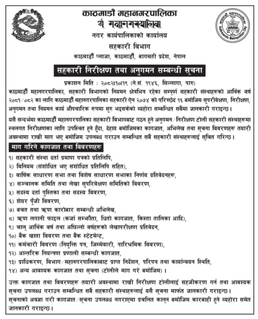 महानगरपालिकाको सहकारी विभागद्वारा जारी गरिएको सूचनामा उल्लेख गरिएको छ । आगामी दिनहरूमा सहकारी संस्थाहरूको गतिविधिहरूको निगरानी गरिनेछ। यस क्रममा, सहकारी संस्थाहरूले १४ विभिन्न प्रकारका कागजात र अभिलेख पेस गर्नुपर्नेछ।